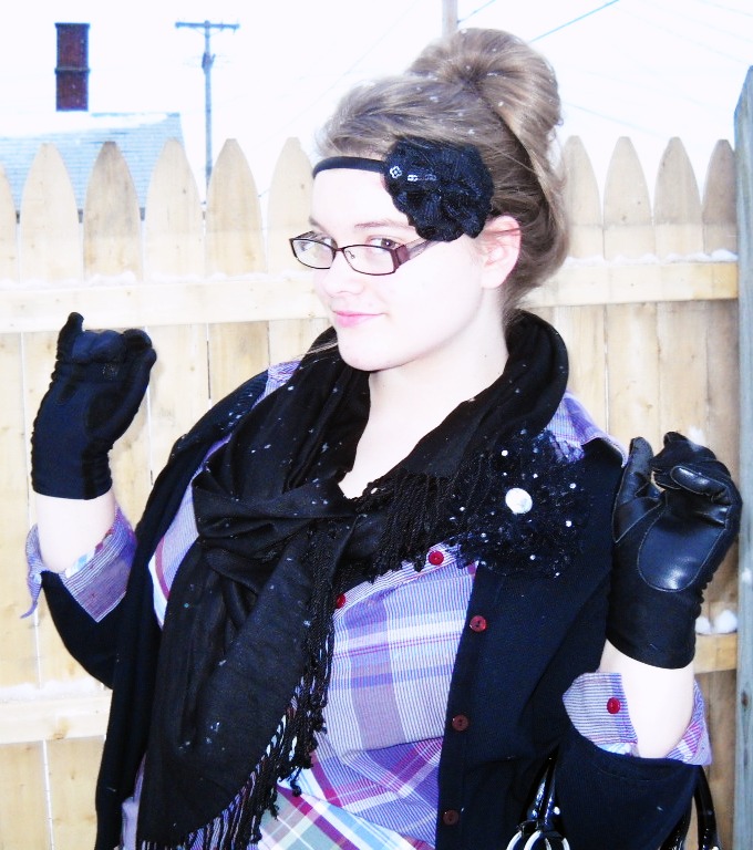 Tights - JCPenneys, Shirt - Sam's club, Vest - Goodwill, Boots - Walmart, Purse - Gift, Scarf - Gift, Skirt - Ebay.